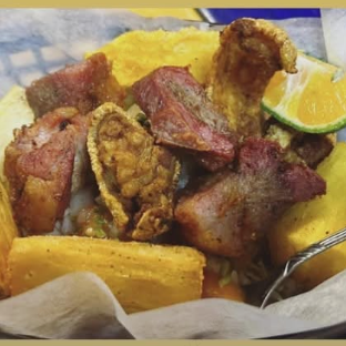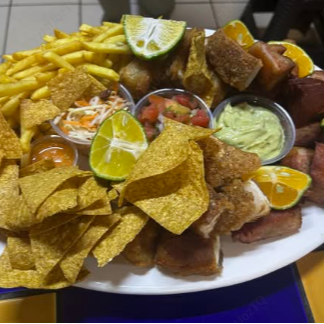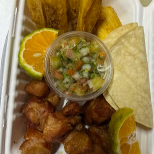 200 gramos de chicharrón de carne de cerdo, ensalada (repollo, tomate y limón), 2 tortillas (yuca frita o papas a la francesa).