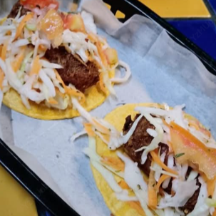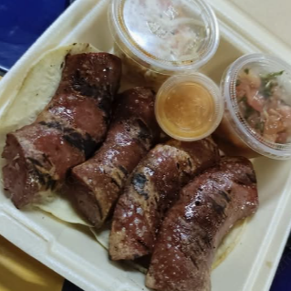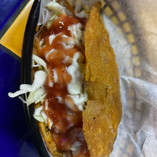 Empanada de chicharrón de carne, repollo rallado, salsa de tomate y mayonesa de la casa.