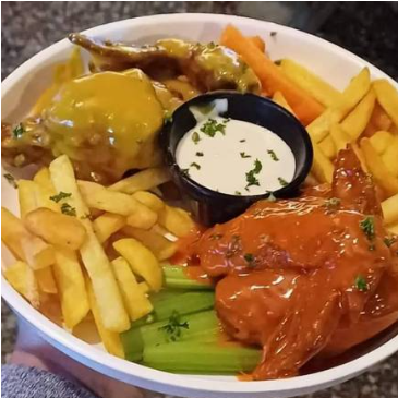 Alitas de pollo con un empanizado especial y ligero, adobadas con condimentos caseros. Acompañamiento: apio, zanahoria, salsa ranch casera y 100g de papas fritas.