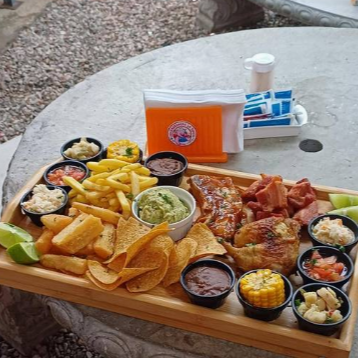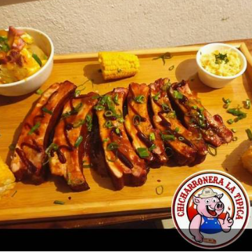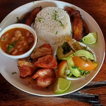 400 gramos de carnes entre ellos chicharrón de posta y panzada, costilla San Luis y pollo ahumado. Guarniciones de la casa como papas fritas, yuca frita, frijoles molidos, guacamole, pico de gallo y escabeche de banano.