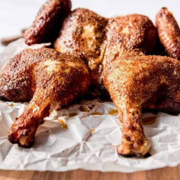 Medio pollo ahumado por 8 horas acompañado con tortillas tostadas y frijoles molidos arreglados.