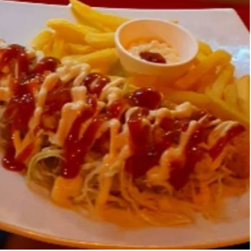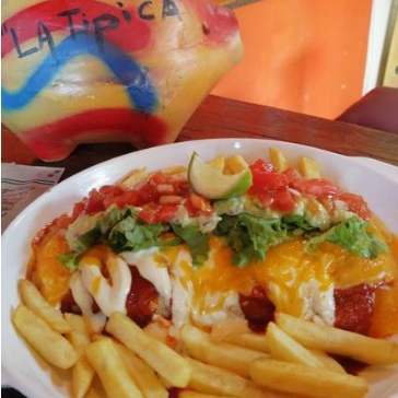 Tortilla de harina envuelta en carne de cerdo preparada, frijol molido y queso. Por arriba salsa pomodoro, natilla, quesos, guacamole y pico de gallo. Con papas fritas al lado.