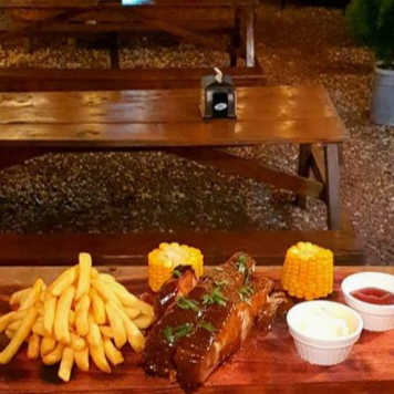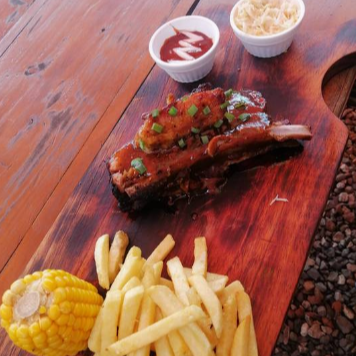 Canasta con 210 gramos costilla ahumada, viene acompañado de papas fritas, maíz tipo mazorca y ensalada Cole Slaw.