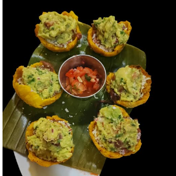 6 unidades de patacones en que puedes escoger de opciones carne mechada, chicharrón de la casa, pollo o carne mexicana; viene con guacamole y pico de gallo.