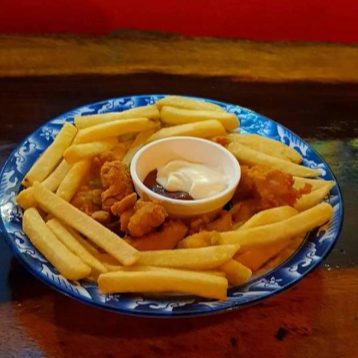 50 gramos de deliciosos nuggets de pechuga de pollo empanizados, acompañados de papas fritas.