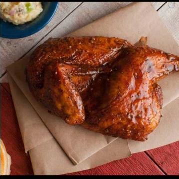 1 pollo ahumado por 8 horas acompañado con tortillas tostadas y frijoles molidos arreglados.