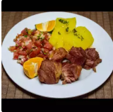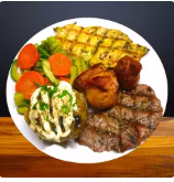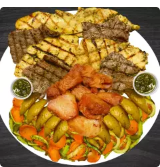Mixto de carnes de 80g. de Lomo, 80g. de Pollo y 80g. de Chicharrón de carne. además te incluye 2 acompañamientos y Té Frio de la casa!
