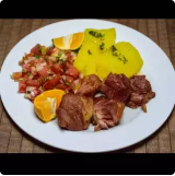 Delicioso corte importada mariposa 100 % a la parrilla con 2 acompañamientos a elegir y chimichurri argentino aparte.