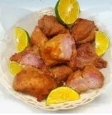 Medio Kilo de delicioso y jugoso chicharron 100% de Carne marinado con nuestra receta secreta y cocinado en paila a fuego lento, acompañado de tormtillas y limones.