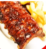 Deliciosa costilla importada de cerdo 100% a la parrilla con 2 acompañamientos y salsa BBQ aparte.