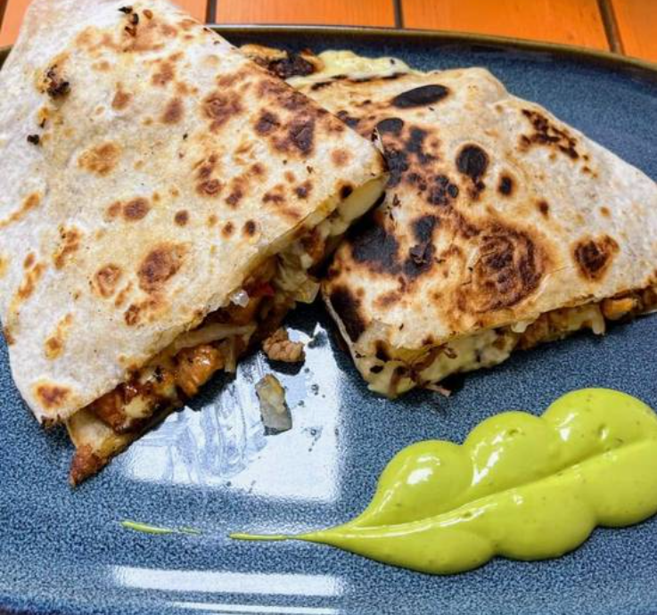 Quesadilla con tortilla de harina, carne a elegir: pastor, bistec o pollo.