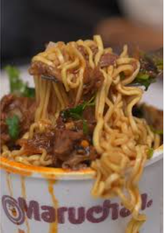 Sopa maruchan con consomé de birria, cebolla, cilantro y carne al pastor.