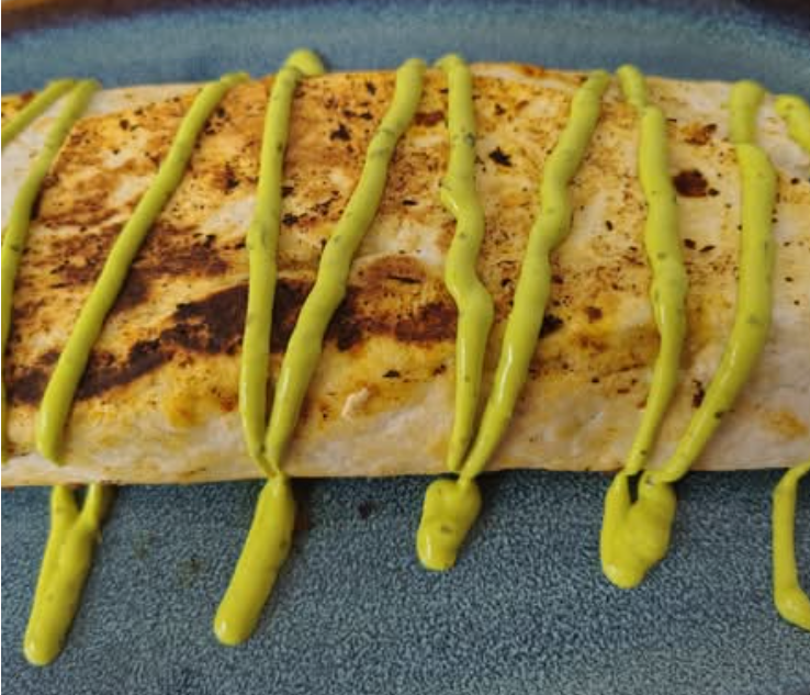 Tortilla alargada rellena de frijoles, queso mozzarella fundido, lechuga y carne a elegir (carne al pastor, bistec de res o pollo), salsa de la casa por aparte.