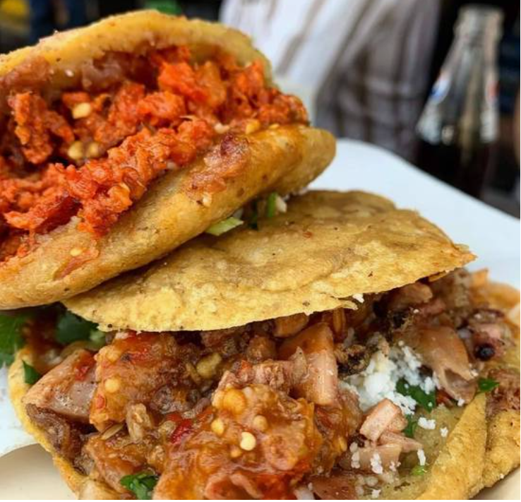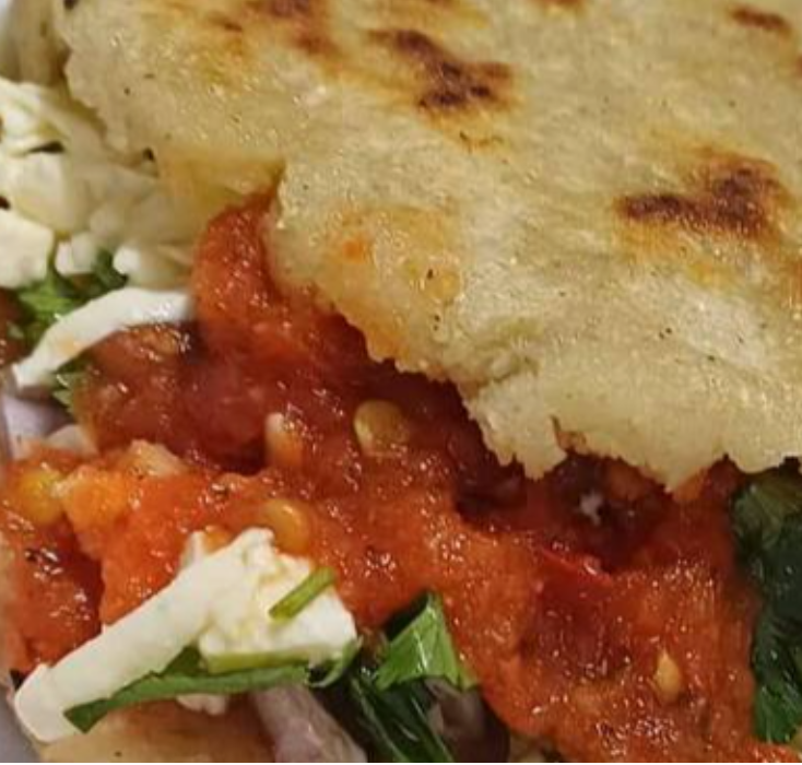 Carne de res o cerdo con queso mozzarella derretido, cebolla, cilantro y chile dulce, salsa de la casa por aparte.