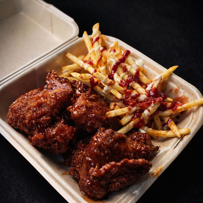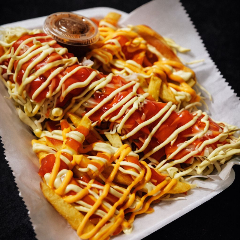 Papas fritas (300 gr) con trocitos de pollo (200 gr) en nuestra salsa BBQ con queso mozzarella y salsa ranch encima