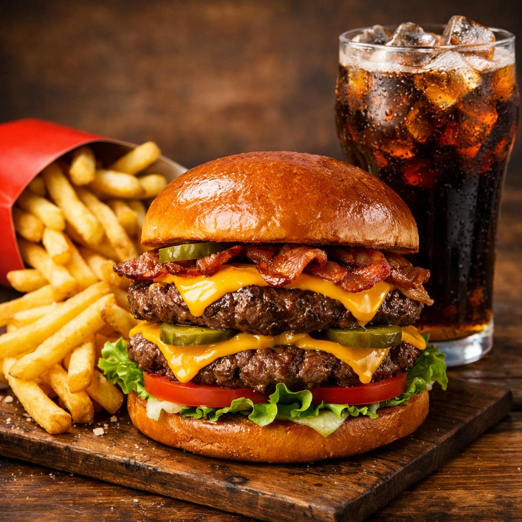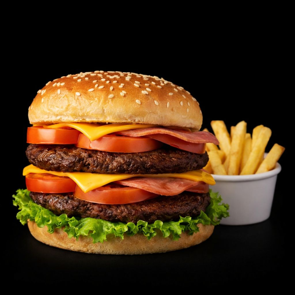 hamburguesa doble estilo cheeseburger con BBQ y alioli, papas francesas con alioli flameado y toque de albahaca