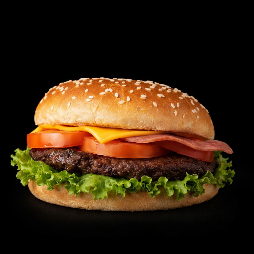 hamburguesa sencilla. Carne tomate, lechuga, cebolla, jamon, queso americano y nuestras salsas. Incluye papas para acompañar