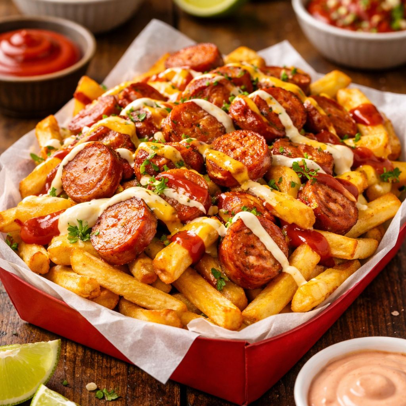 Salchichas, papas, plátano maduro, queso mozzarella y cheddar, salsas especiales