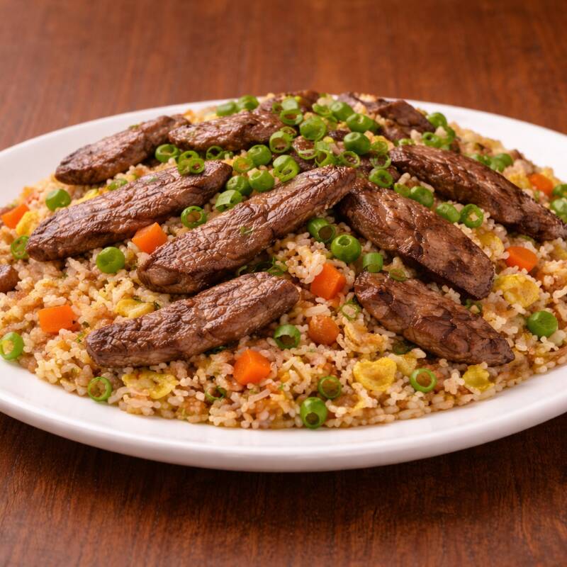 ¡Siente el verdadero "sazón de wok"! Preparamos este arroz frito con ternera a fuego alto para lograr ese sabor ahumado y único. Combinado con vegetales frescos y huevo, es un plato equilibrado, sustancioso y lleno de energía.