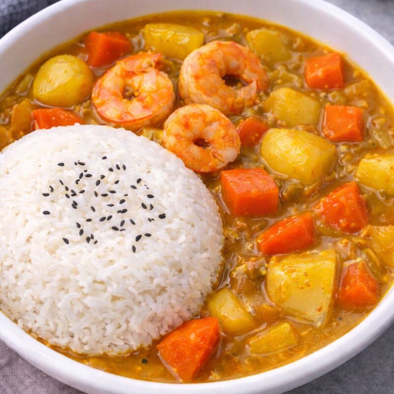 Plato completo de curry japonés servido con camarones grandes y de textura firme. La salsa es espesa, suave y con un toque dulce, acompañada de papa y zanahoria sobre arroz blanco. Una opción de alta calidad para quienes disfrutan del marisco con el sabor auténtico del curry.