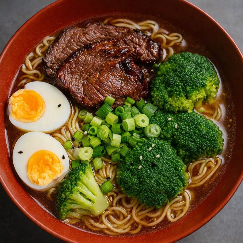 Delicioso ramen japonés de res con caldo rico y concentrado, fideos suaves y abundante carne jugosa. Servido con huevo y vegetales frescos. Un plato caliente que realmente satisface.