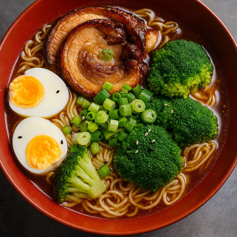 Ramen japonés con caldo intenso, fideos suaves y cerdo estilo chashu hecho con panceta, tierno y lleno de sabor. Acompañado de huevo y vegetales frescos. Perfecto para disfrutar bien caliente.