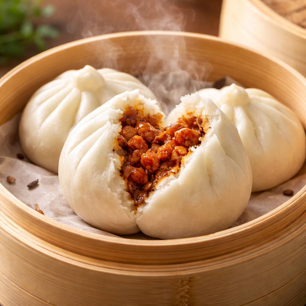 “Pan al vapor relleno de char siu (cerdo BBQ chino), con un sabor dulce y aromático típico de la cocina cantonesa