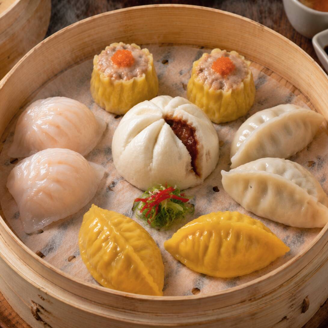 2 Gyoza de cerdo • 2 Gyoza de camarón con maíz • 2 Siu Mai • 2 Hakao (Camarón) • 1 Cha Siu Bao