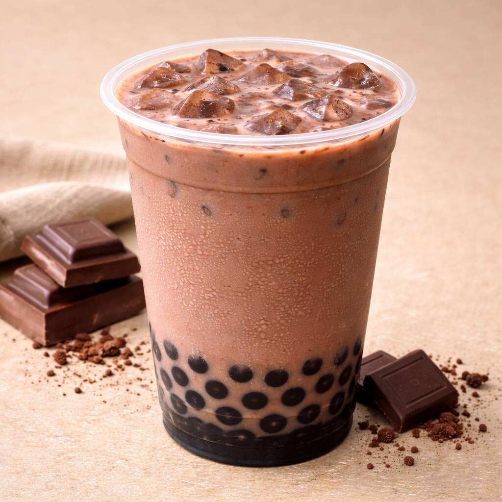 Bebida fría de chocolate con leche y perlas de tapioca. Un sabor dulce y tradicional, ideal para los que buscan algo refrescante y clásico
