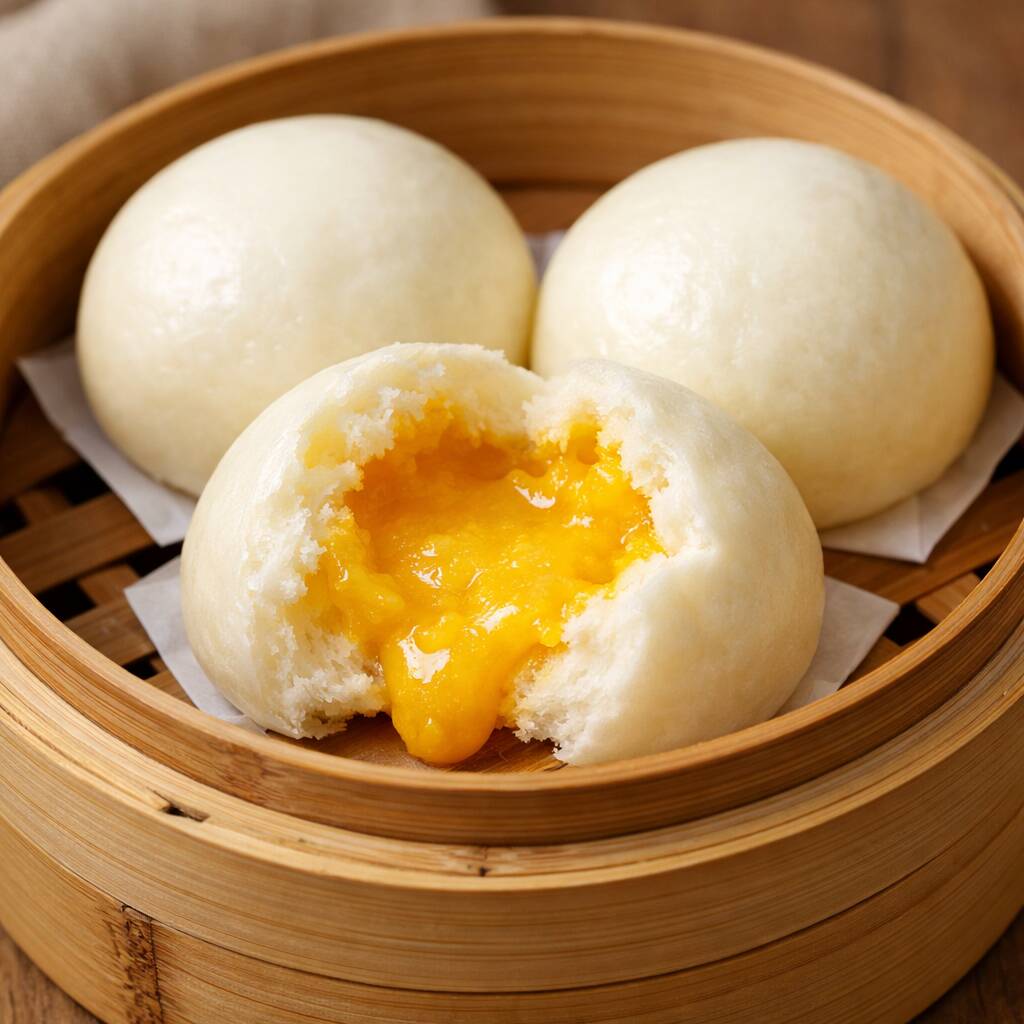 Pan al vapor relleno de crema de huevo, con un sabor suave y ligeramente dulce que se derrite en la boca.