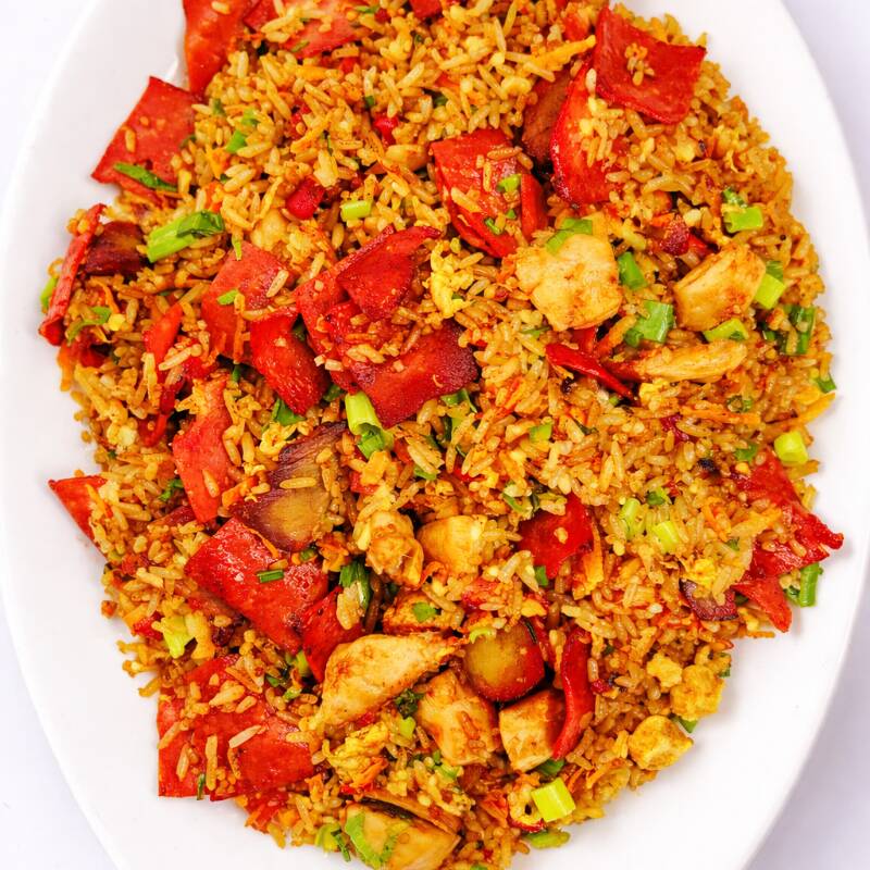 El favorito de todos. Arroz frito al wok con una deliciosa mezcla de pollo, jamón y trozos de lechón. Preparado con huevo y cebollino para resaltar su aroma tradicional. Una porción abundante, perfecta para saciar tu antojo de auténtica comida asiática.