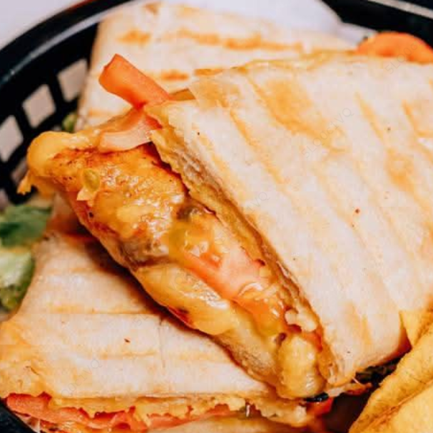 Mezcla de 3 tipos de quesos gratinados, con lechuga, tomate y chips