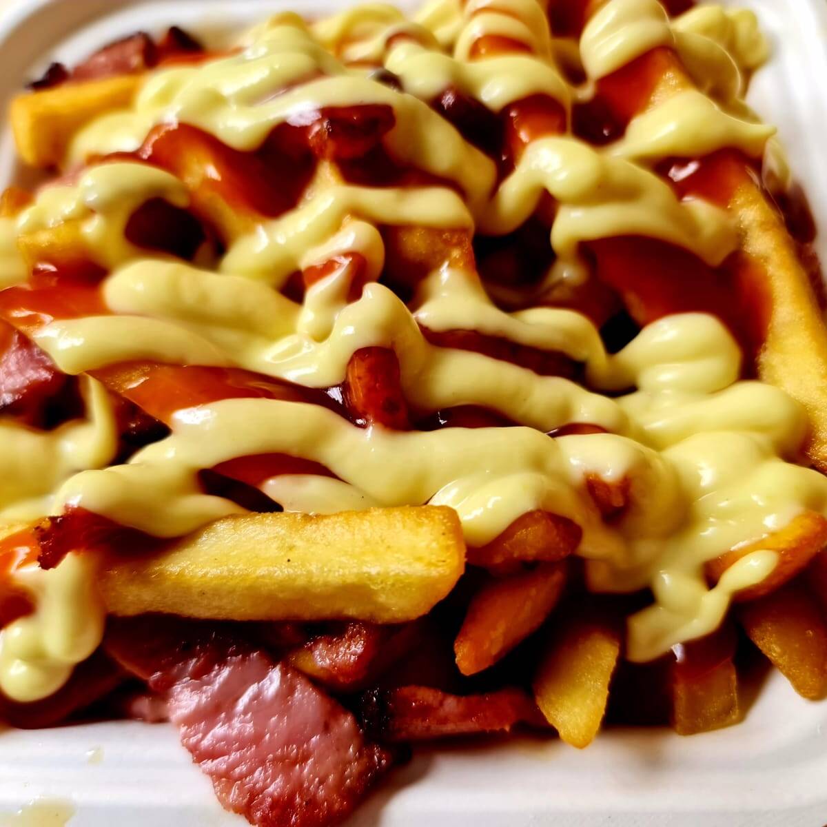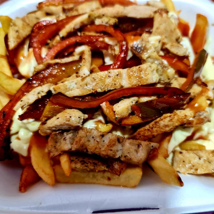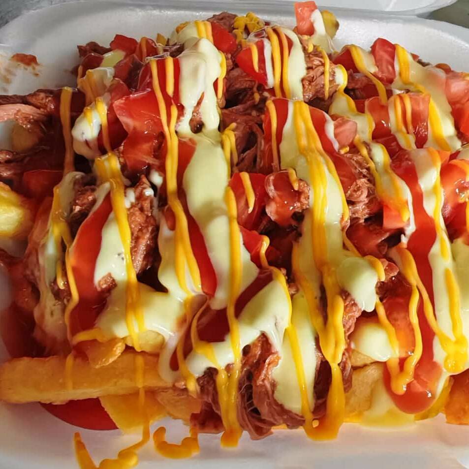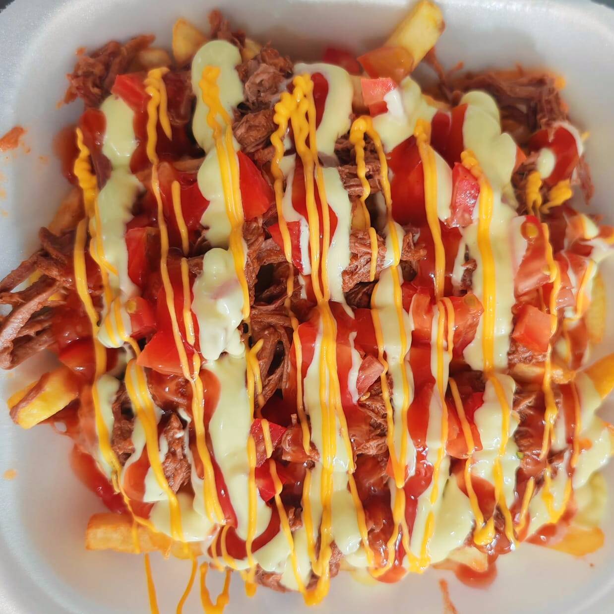 Papas fritas con carne mechada, tomate, queso chédar y salsas por encima.
