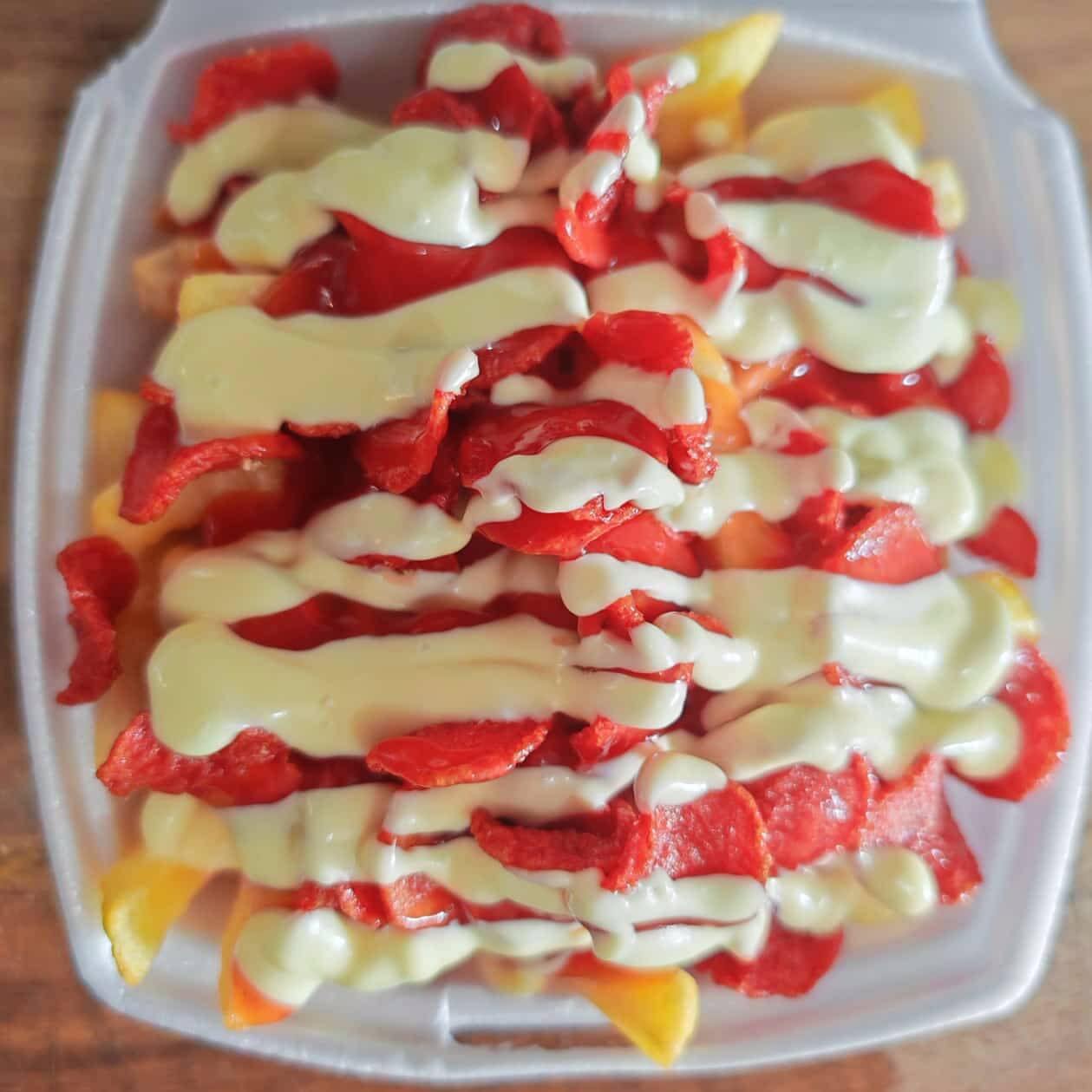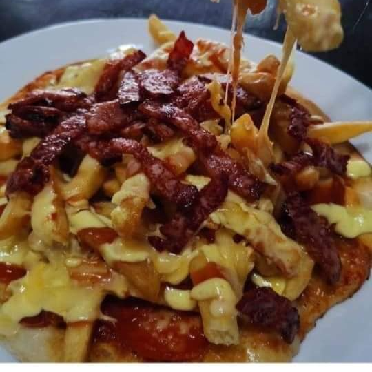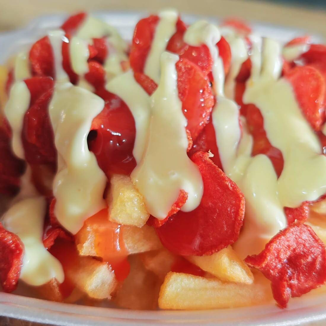 Papas fritas con carne mechada, tomate, queso chédar y salsas por encima.