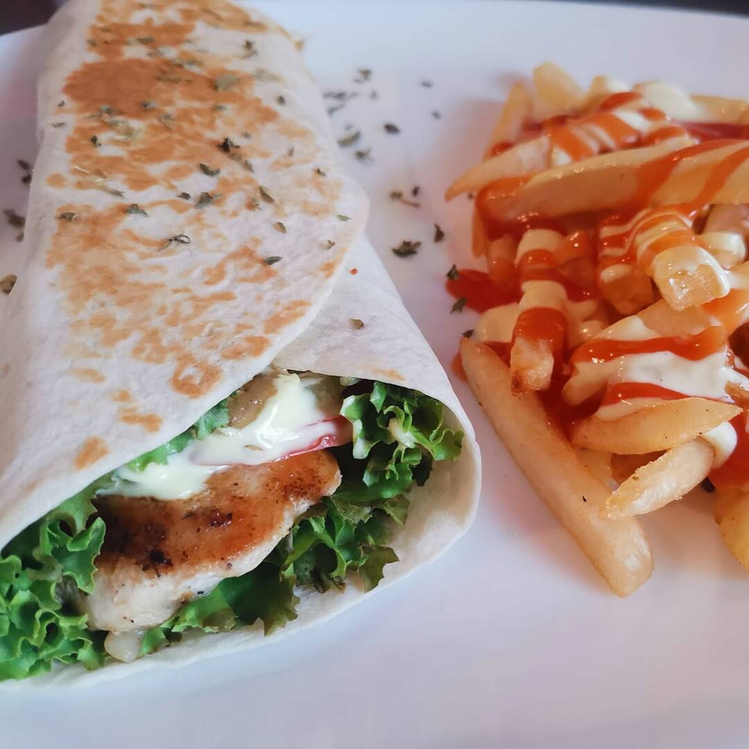 Tortilla de harina grande, salsas, lechuga, tomate y pollo a la plancha