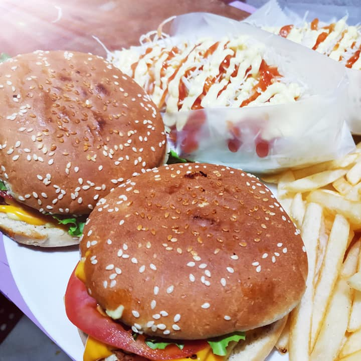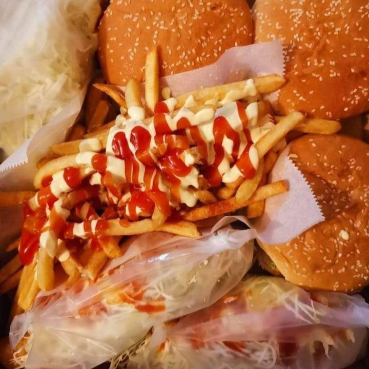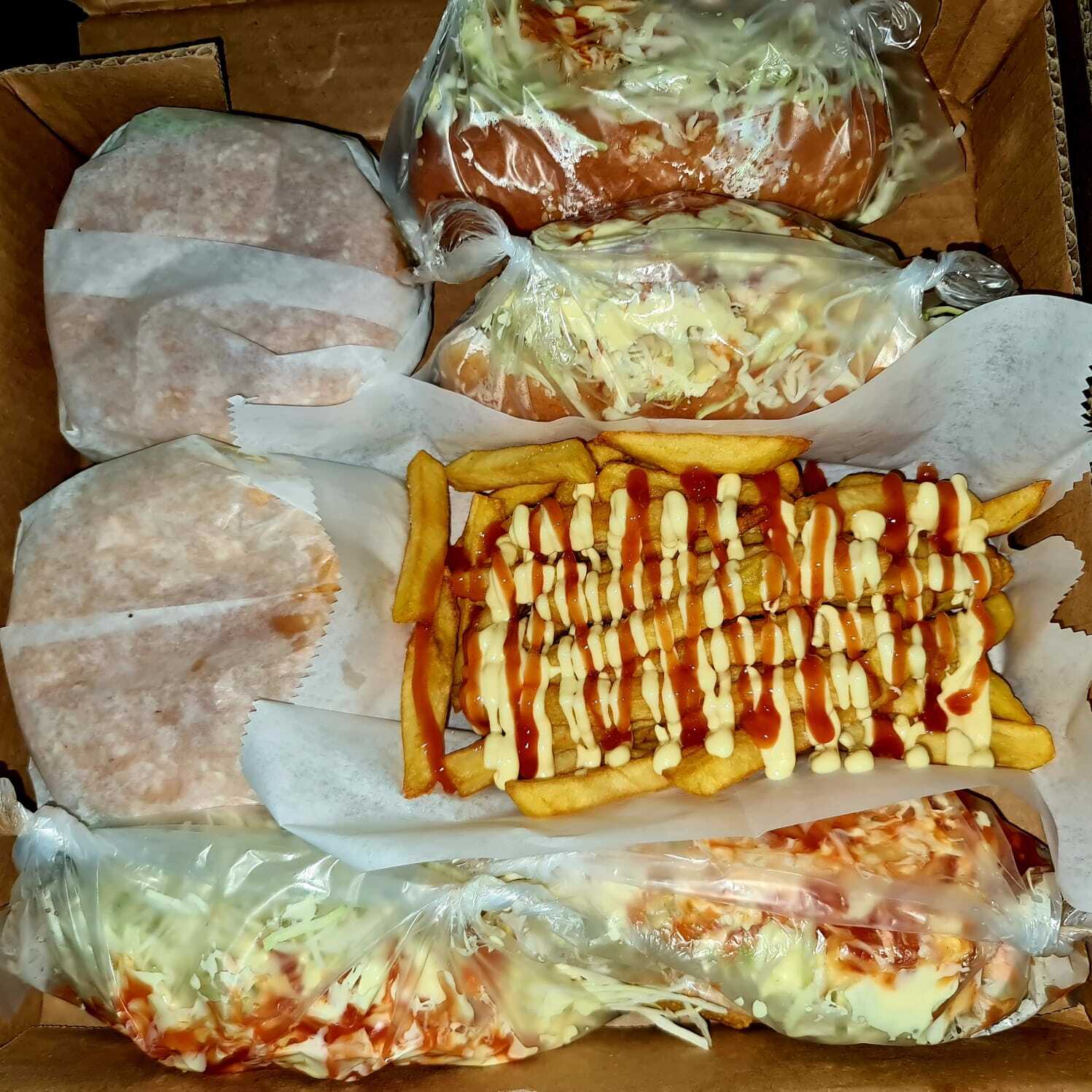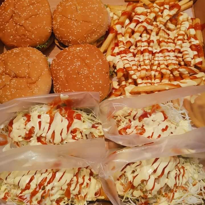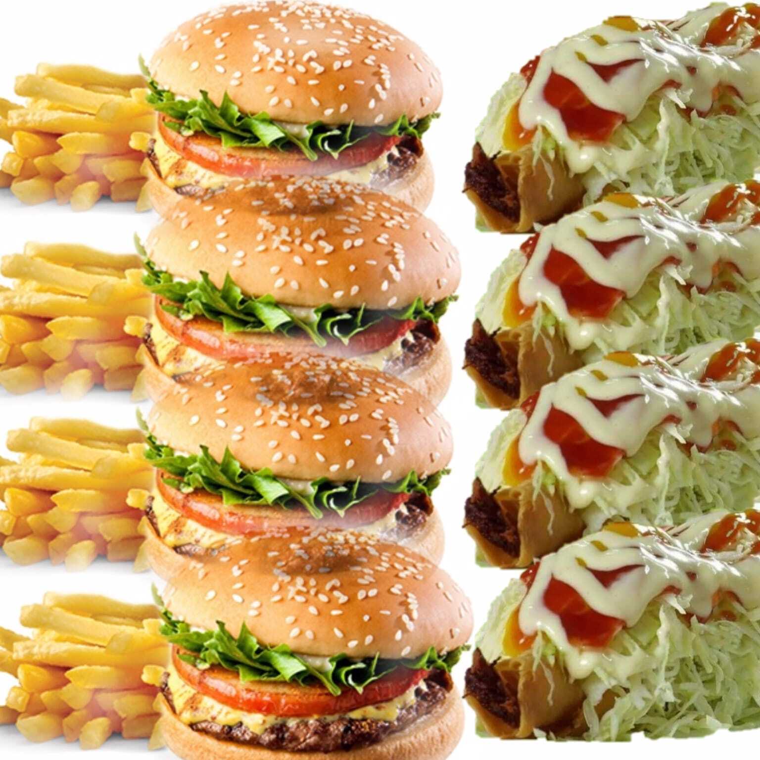 4 hamburguesas grandes con queso, 2 taco, 2 hot dog y papas