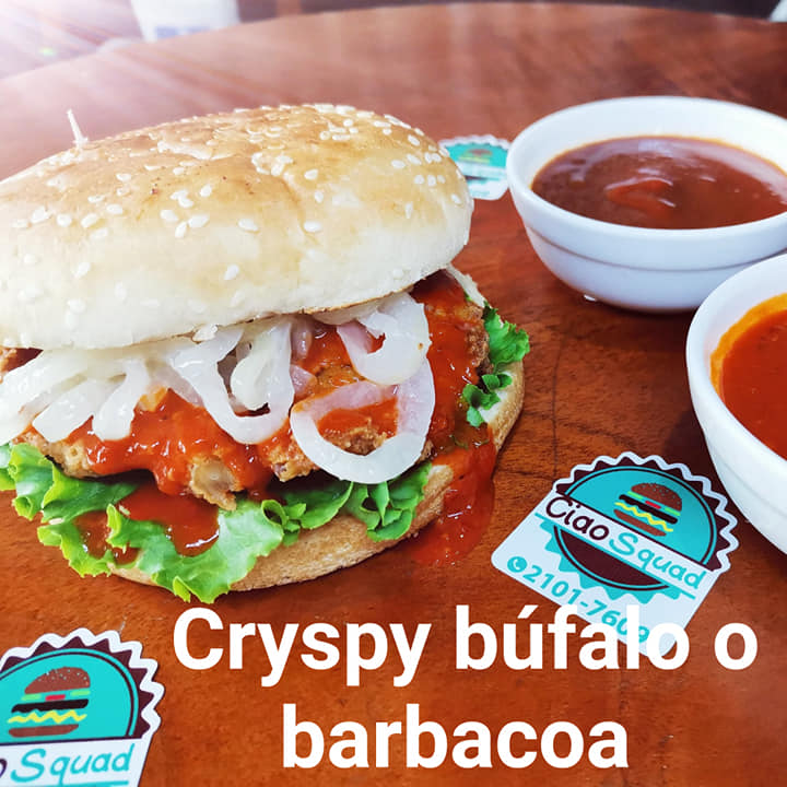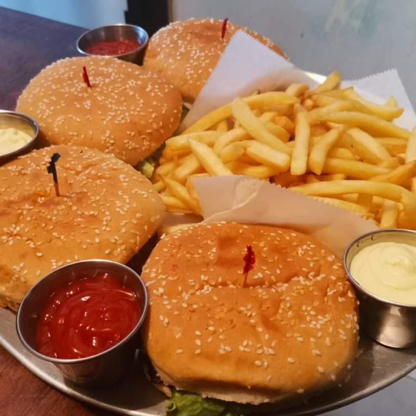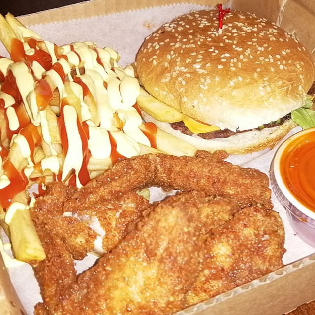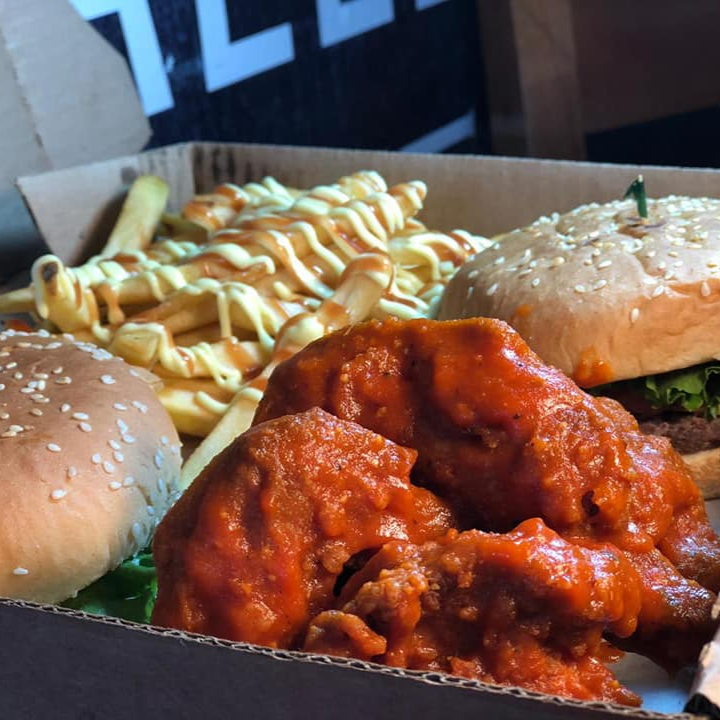 3 hamburguesas grandes con queso, 6 alitas bbk o búfalo, 3 super taco y papas
