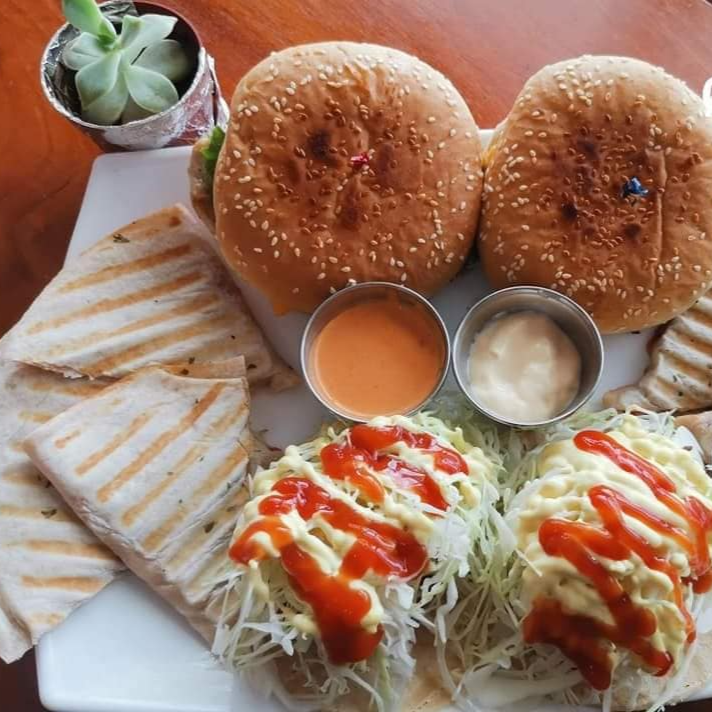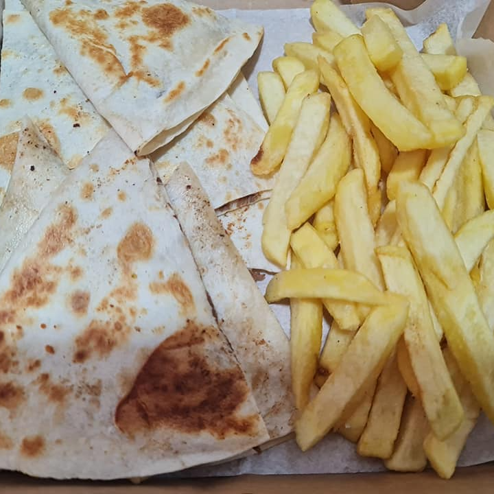 2 Hamburguesas grandes con queso, 6 quesadillas de jamón y queso y papas.