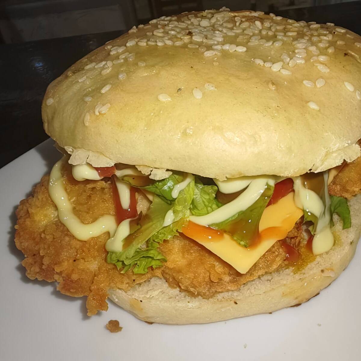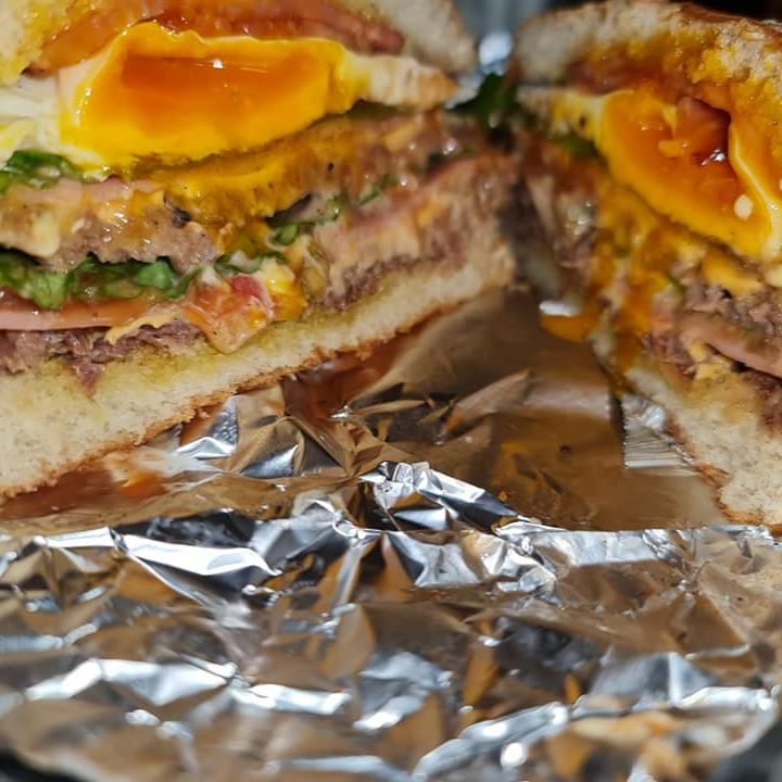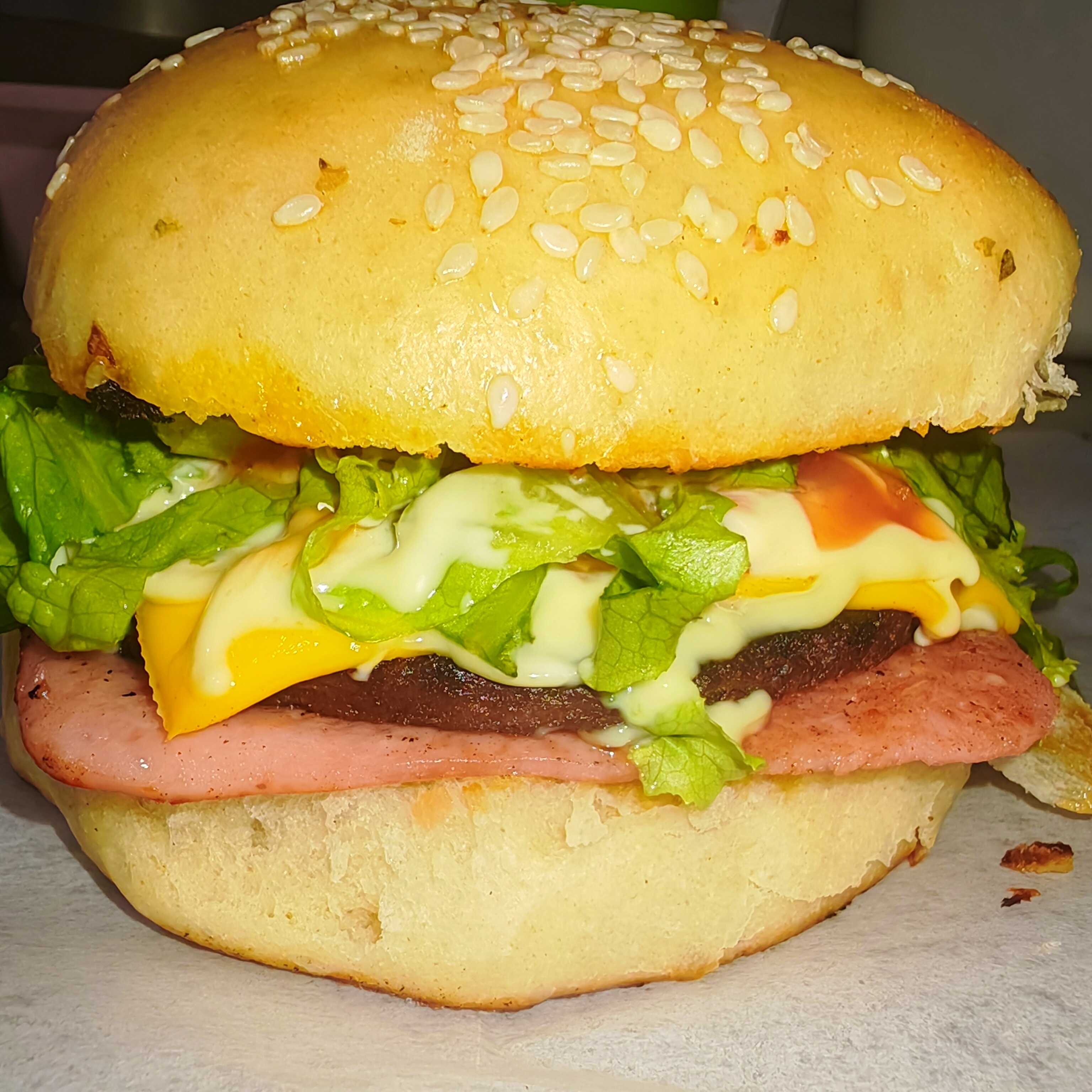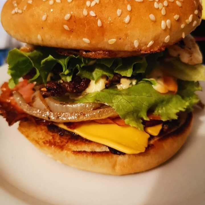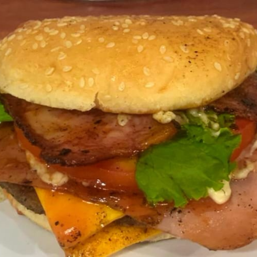 2 tortas, 2 quesos, tocino, jamón, cebolla, lechuga, tomate, cebolla cocinada y huevo frito + salsas