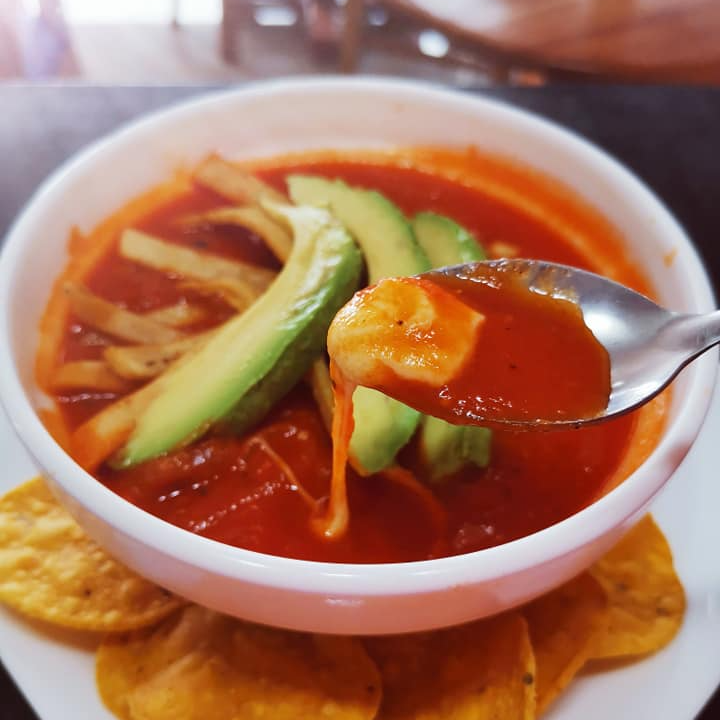 Sopa de tomate con chil picante y queso mozarella, ademas de unas tortillitas, NO AGUACARE