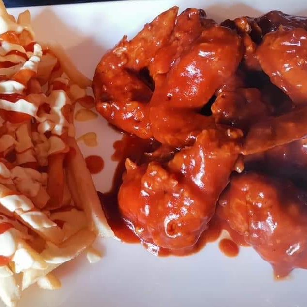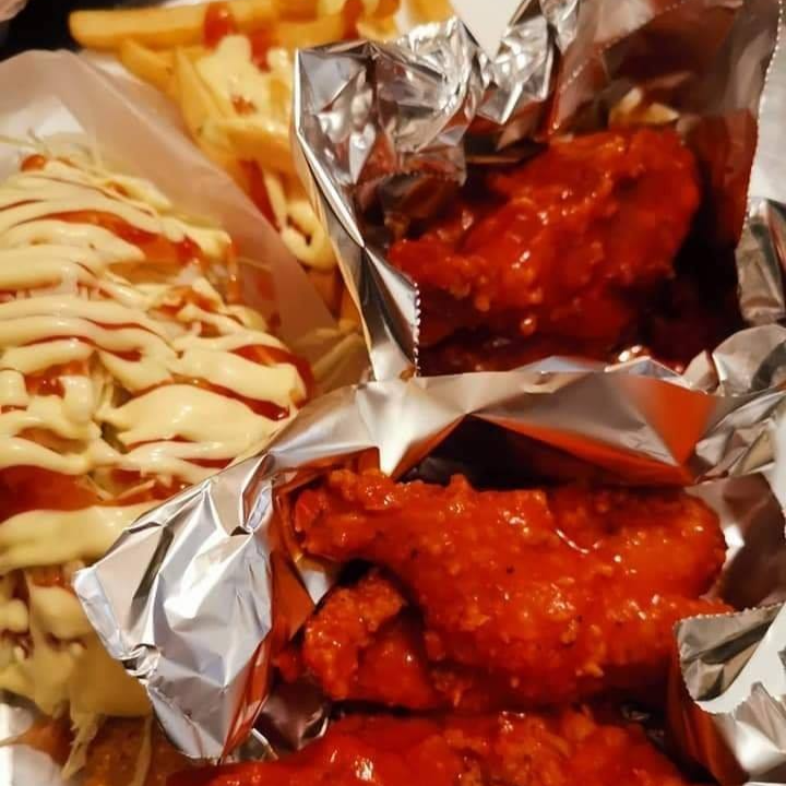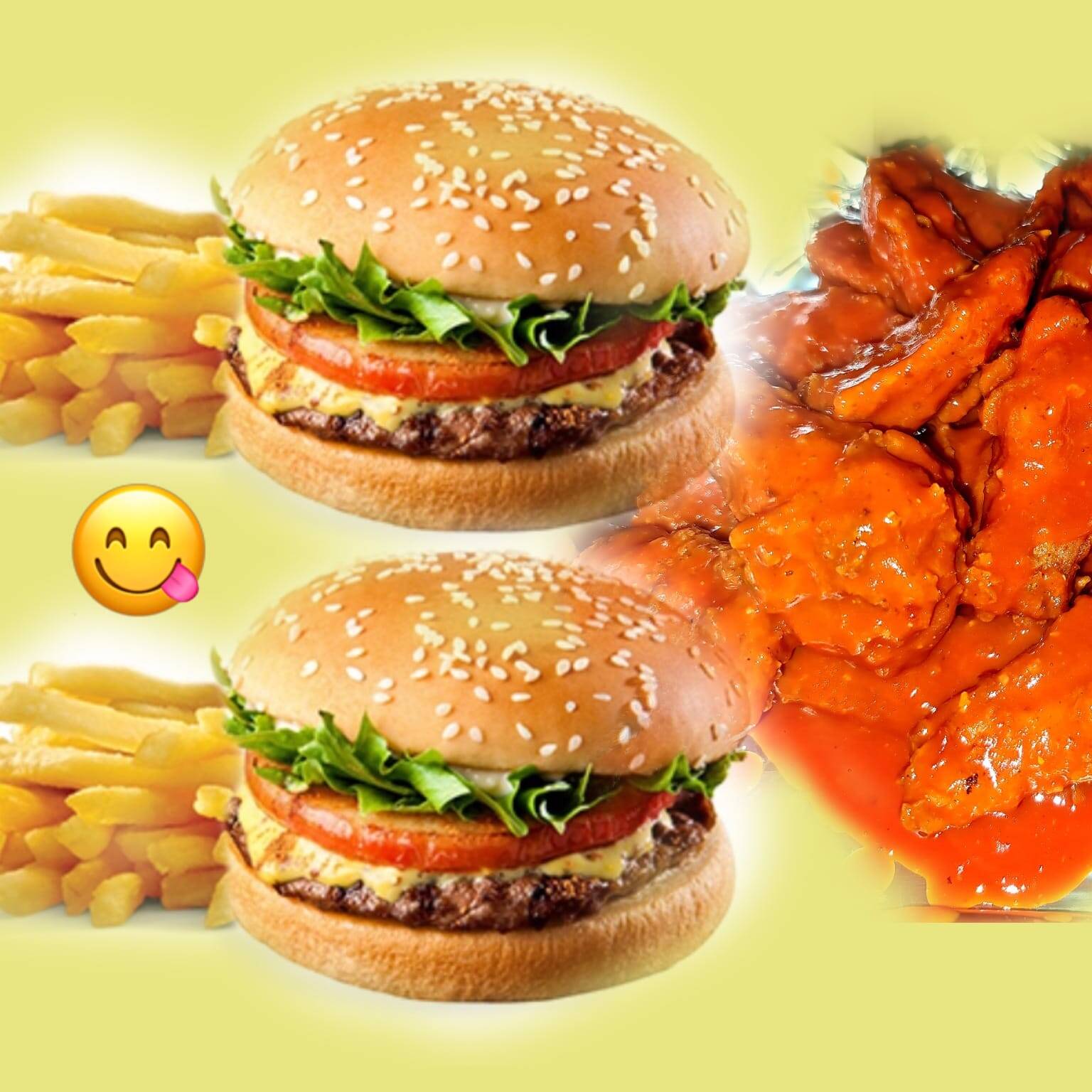 6 alitas en salsa bbk con papas*2 + hamburguesa sencilla con queso*2 + Papa Pequeña*2