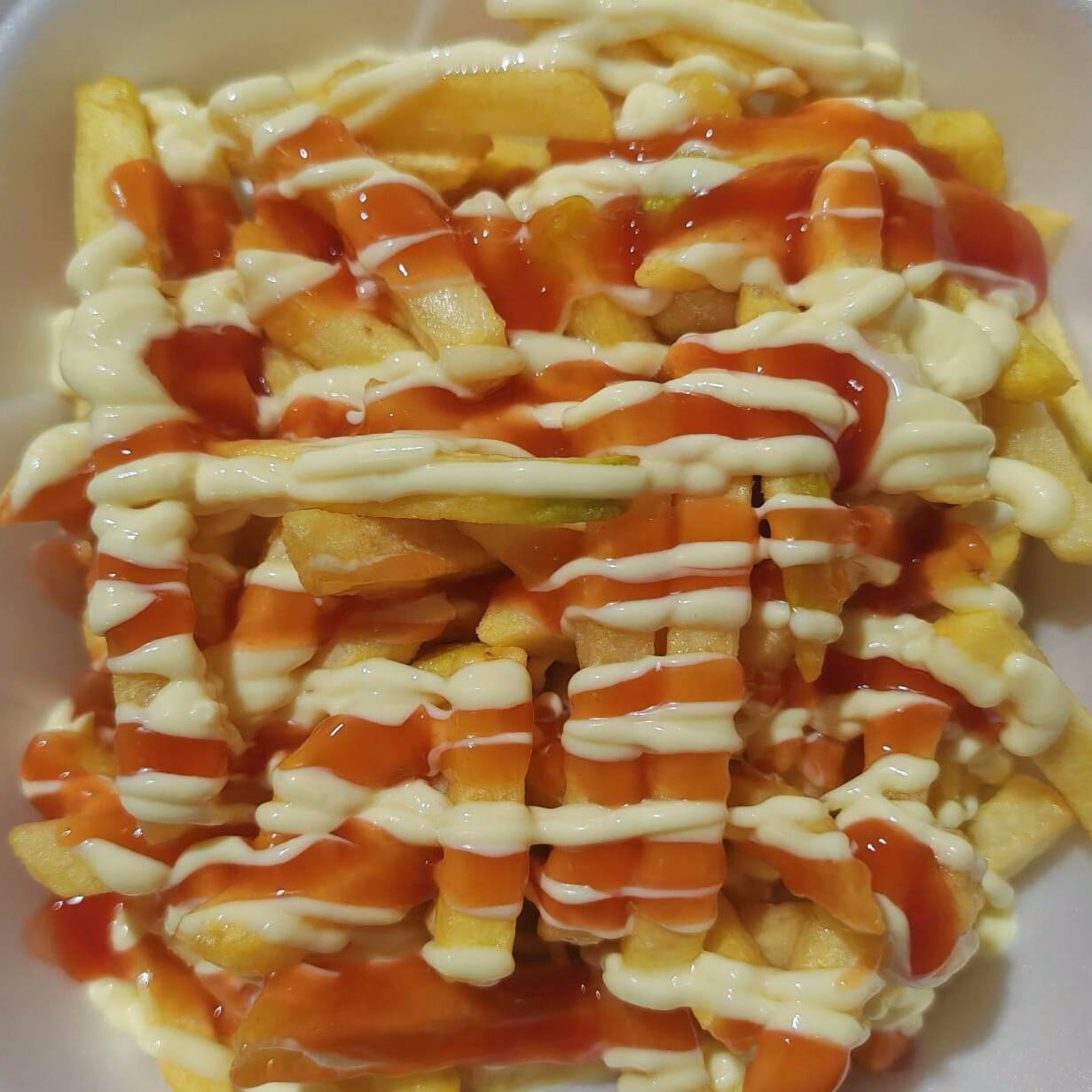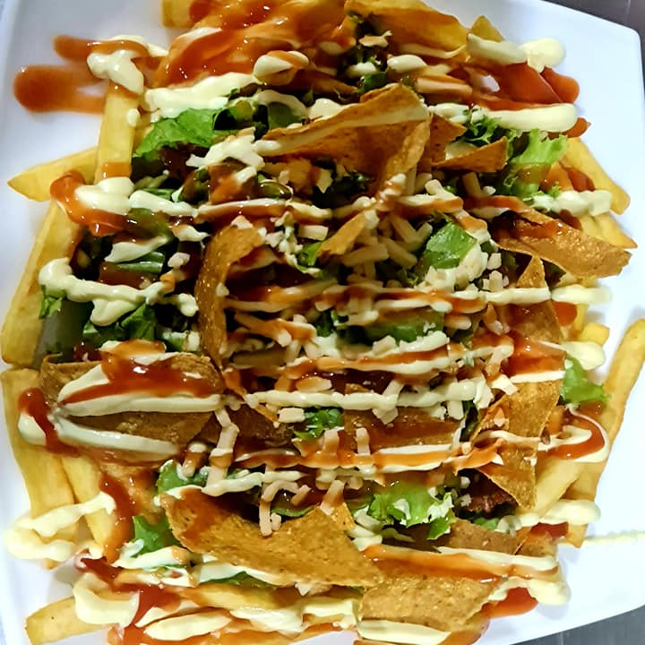 Lechuga, carne mechada, queso, tomate, salsa de tomate, mayonesa, nachos y papas a la francesa