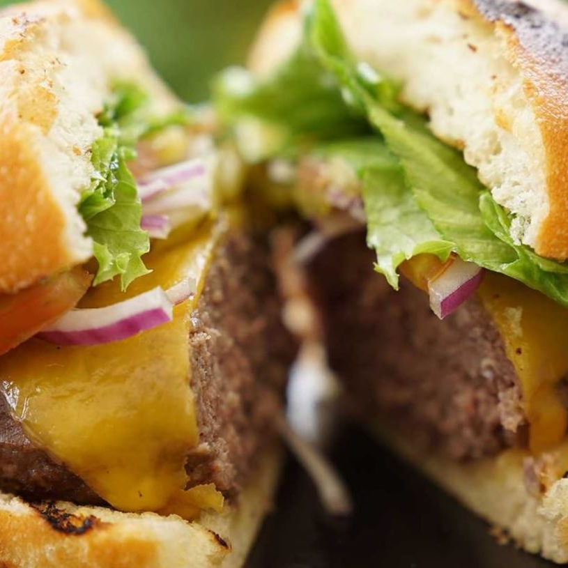 pan, torta, queso, tocino, cebolla, tomate, lechuga y salsas