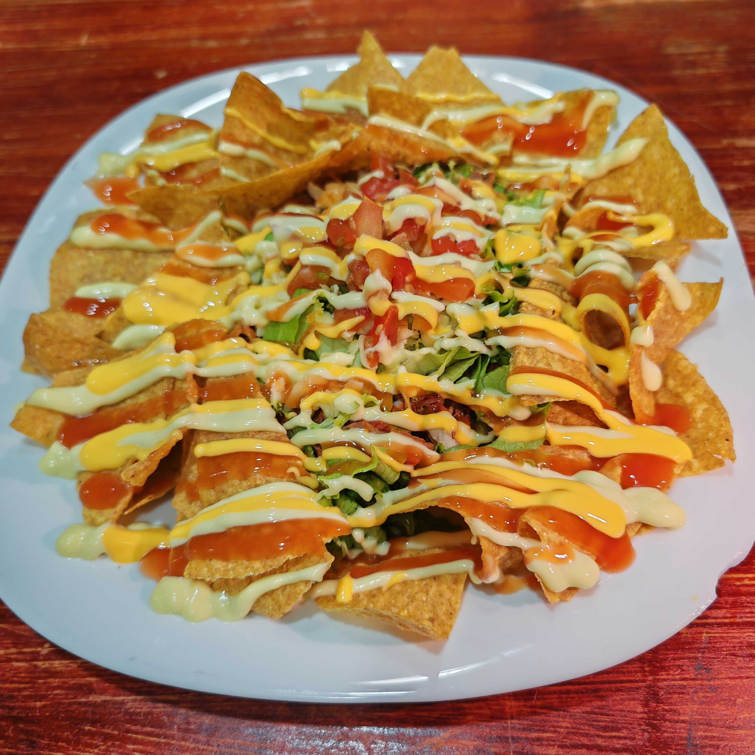 Lechuga, fajitas de pollo, queso, tomate, salsa de tomate, mayonesa y nachos