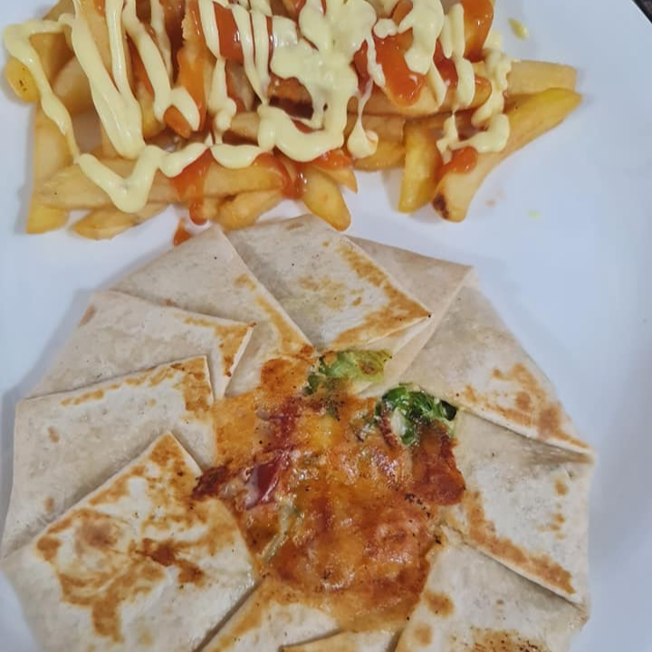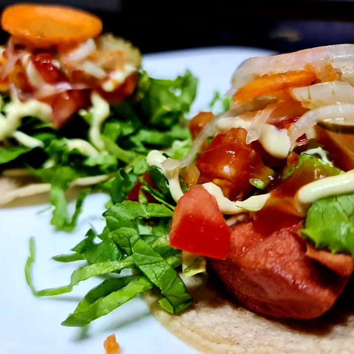 2 Tortillas tortirrica con pescado empanizado y repollo o lechuga con salsas, especificar cuál le gustaría.
