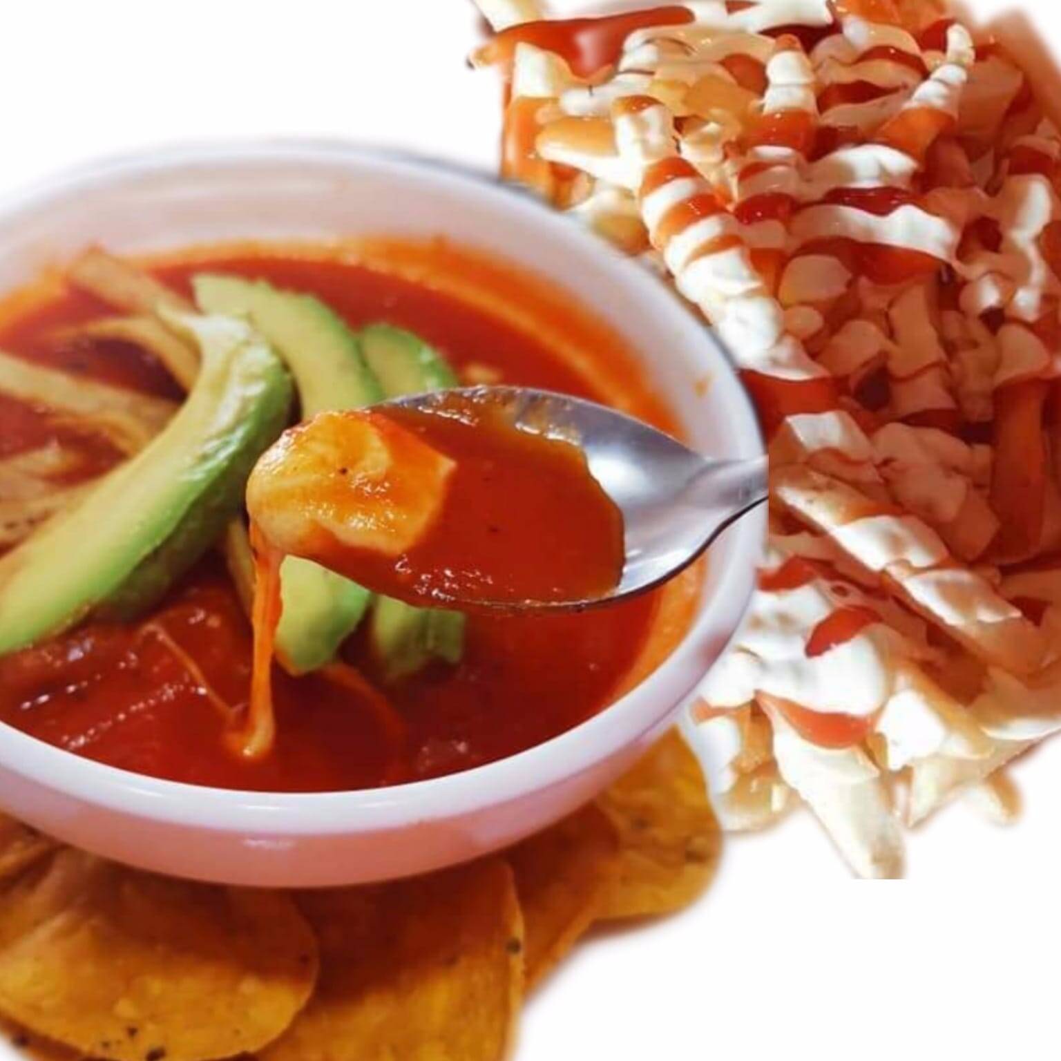 Sopa Azteca con Pollo (pica) y Salchi Papa Pequeña