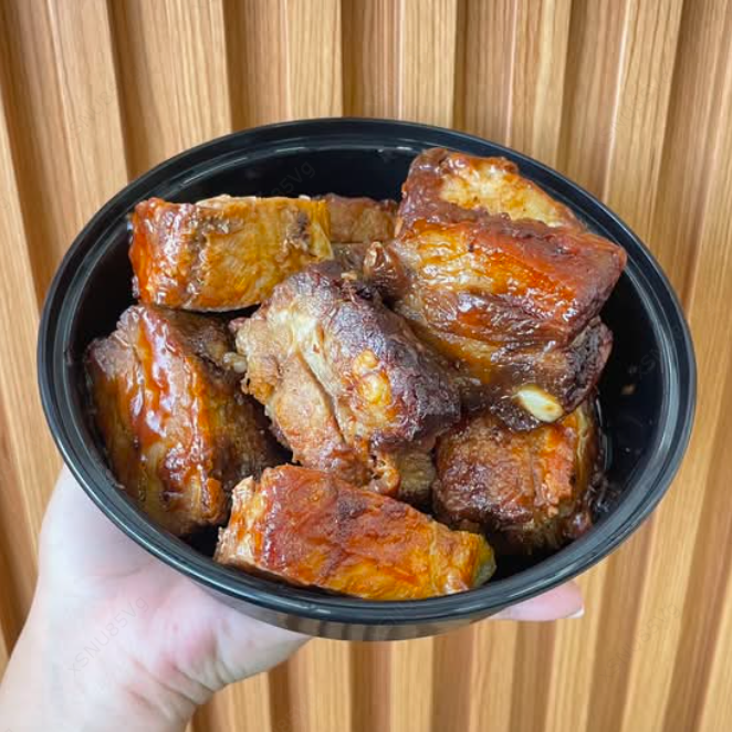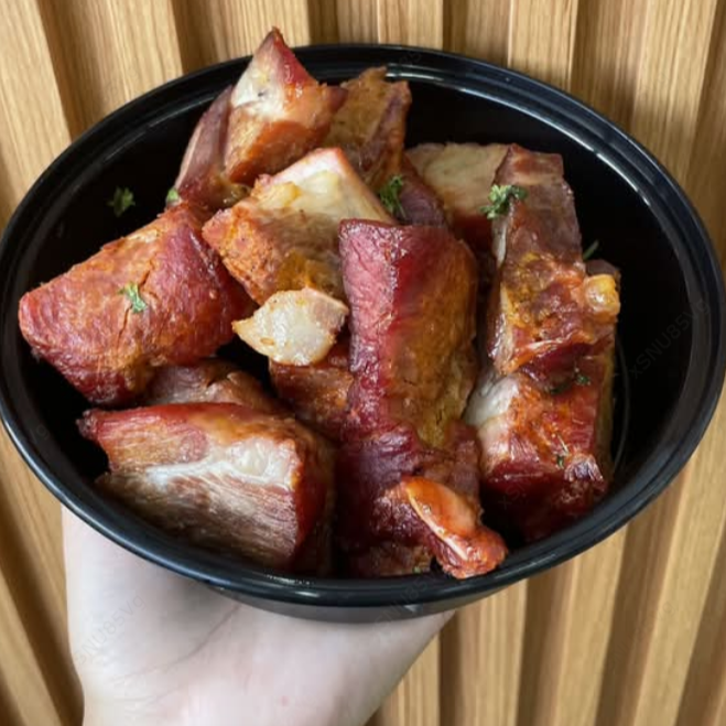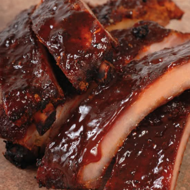 Jugosa costilla criolla en tiras, adobada y bañada en salsa BBQ.