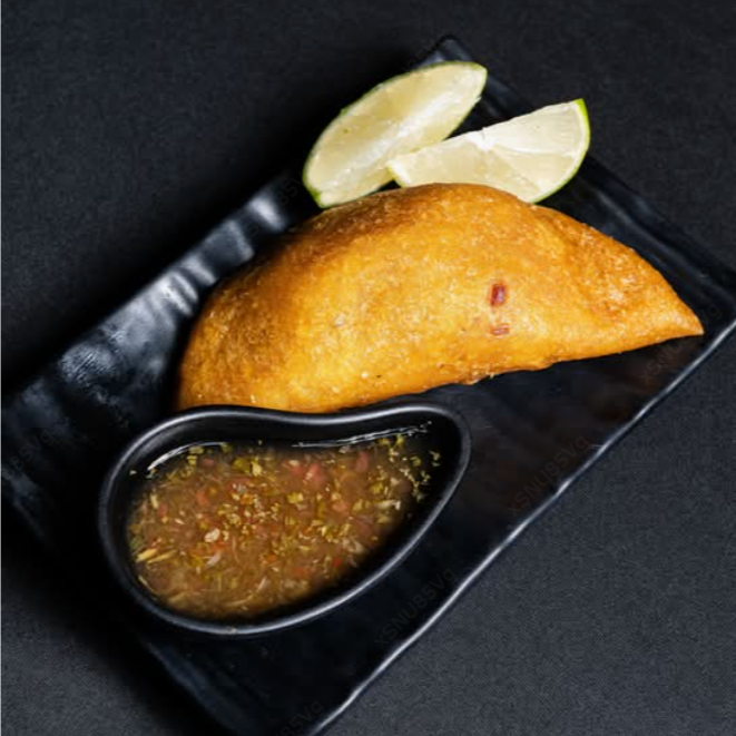 Deliciosa empanada de chicharrón frita en el momento, acompañada de un delicioso ají. Unidad con ají.