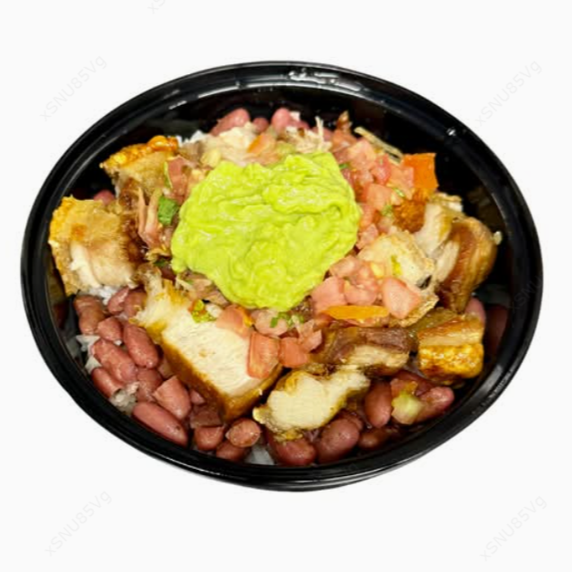 Deliciosa combinación de arroz, frijoles tiernos, chicharrón a elección, pico de gallo, guacamole y chips.