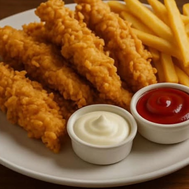 Deliciosas tiras de pollo empanizado acompañado de papas a la francesa o ensalada verde.